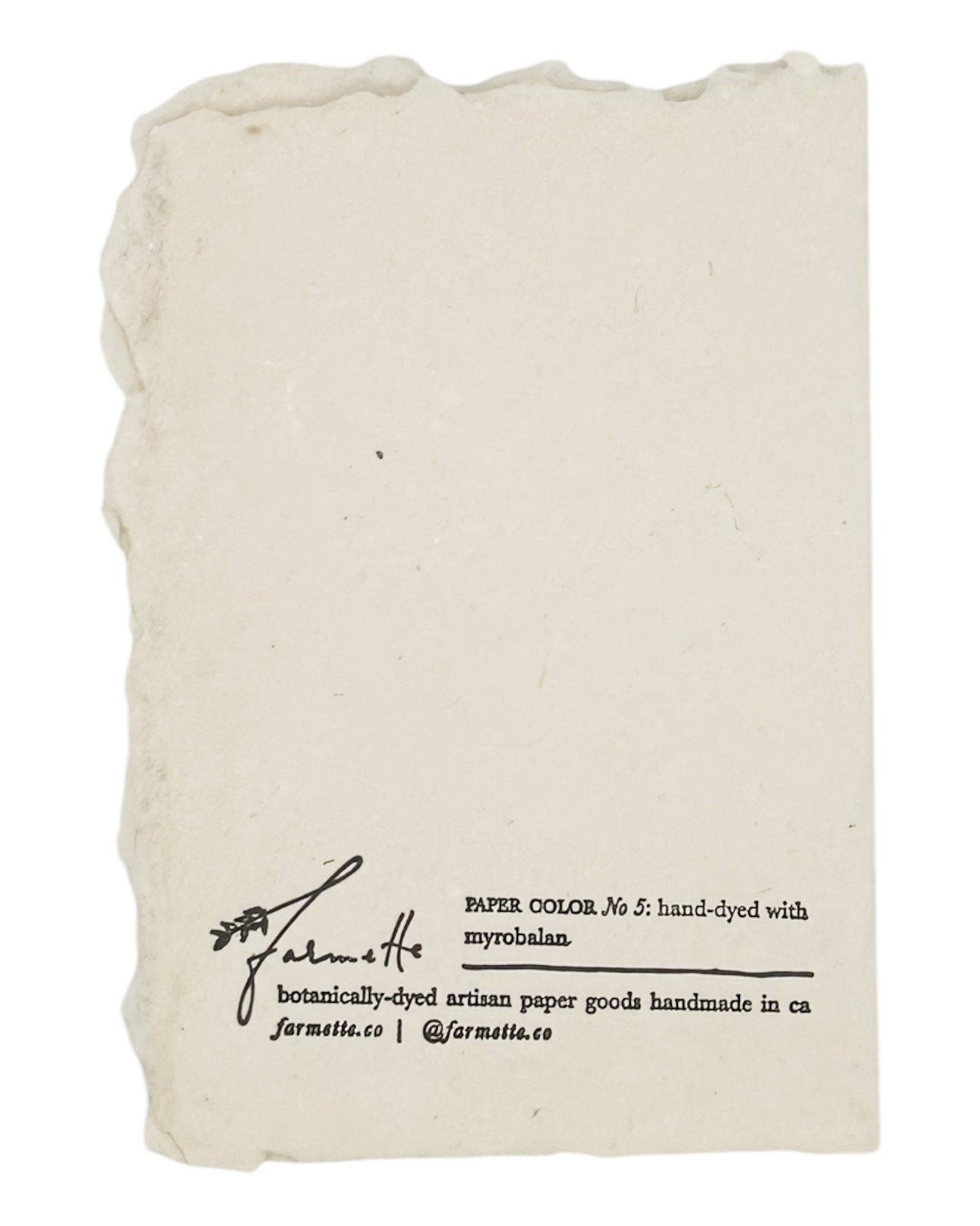 Handmade paper card with four full deckled edges, hand folded with inside blank. Front is letterpress printed; back is letterpress printed with a small note including information about the natural dyes used to color each unique piece of paper.